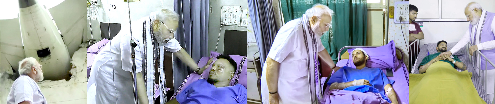 प्रधानमंत्री नरेंद्र मोदी ने शुक्रवार को एयर इंडिया एआई-171 हादसे में जीवित बचे लोगों से मुलाकात की। इसके लिए अहमदाबाद सिविल अस्पताल का दौरा किया। उनके साथ गुजरात के केंद्रीय नागरिक उड्डयन मंत्री राम मोहन नायडू, मुख्यमंत्री भूपेंद्र पटेल, केंद्रीय राज्य मंत्री मुरलीधर मोहोल और राज्य के गृह मंत्री हर्ष संघवी भी मौजूद थे। घायलों के साथ समय बिताने और चल रहे इलाज की समीक्षा करने के बाद पीएम अस्पताल से चले गए है।