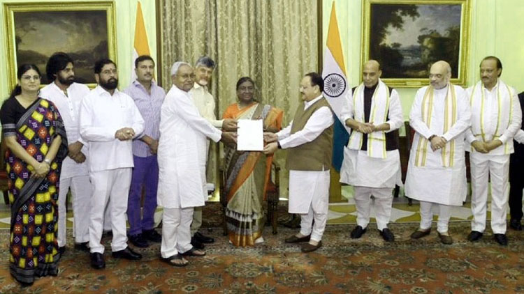 नई दिल्ली| राष्ट्रपति शुक्रवार शाम को एनडीए के संसदीय दल के नेता को सरकार बनाने का न्योता देंगी. इसके बाद 9 जून को शपथ ग्रहण समारोह होना तय हुआ है. इससे पहले शुक्रवार को नई दिल्ली में एनडीए की संसदीय दल की बैठक भी हुई. इस बैठक के दौरान की जो तस्वीर सामने आई है, उसमें टीडीपी चीफ चंद्रबाबू नायडू और जदयू प्रमुख नीतीश कुमार पीएम मोदी के साथ दिख रहे हैं. इस बैठक के दौरान निवर्तनमान पीएम मोदी को एनडीए गठबंधन दल का नेता चुन लिया गया है और इसी के साथ एनडीए ने सरकार बनाने का दावा पेश किया है.