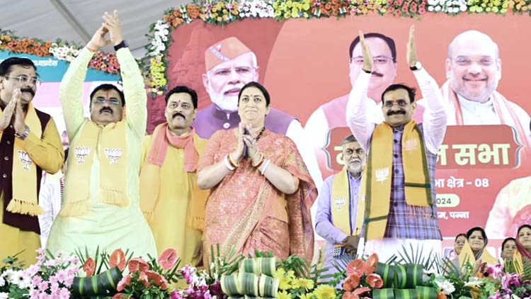 पन्ना। केंद्रीय मंत्री स्मृति ईरानी बुधवार को मध्य प्रदेश के खजुराहो संसदीय क्षेत्र के भाजपा उम्मीदवार विष्णु दत्त शर्मा का नामांकन दाखिल करवाने पन्ना पहुंचीं। उन्होंने यहां कांग्रेस और समाजवादी पार्टी पर जमकर हमले बोले और कहा कि जमाना वंदे भारत का है और वे अब भी साइकिल पर चल रहे हैं। भाजपा ने मध्य प्रदेश इकाई के अध्यक्ष विष्णु दत्त शर्मा को एक बार फिर उम्मीदवार बनाया है। पन्ना में नामांकन भरने से पहले जनसभा हुई और रोड शो भी हुआ। इस मौके पर केंद्रीय मंत्री ईरानी ने कहा, प्रधानमंत्री नरेंद्र मोदी के नेतृत्व में पूरा देश अबकी बार 400 पार का रास्ता देख रहा है। खजुराहो लोकसभा क्षेत्र में तो कांग्रेस पार्टी ने मैदान छोड़ दिया है, समाजवादी पार्टी को उम्मीदवार नहीं मिल रहे हैं। उत्तर प्रदेश से प्रत्याशी लेकर समाजवादी पार्टी आई, फिर दो दिन बाद ही प्रत्याशी बदल दिया।