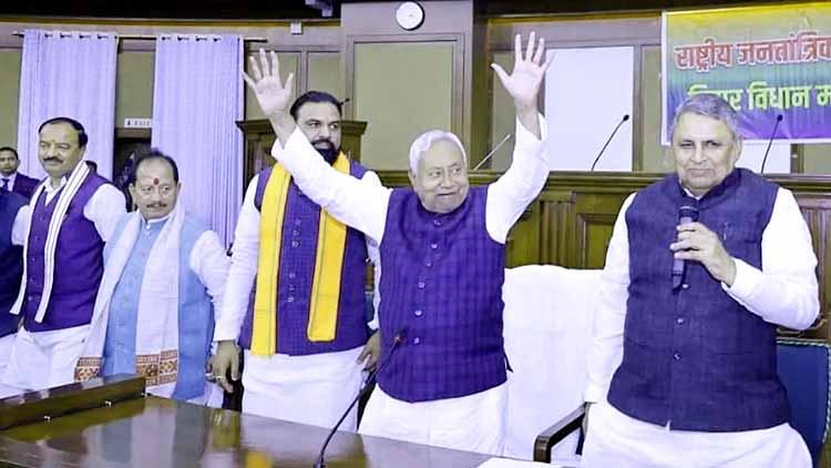 एजेंसी, पटना। बिहार के मुख्यमंत्री नीतीश कुमार ने बुधवार को राष्ट्रीय जनतांत्रिक गठबधन (राजग) विधायक दल का नेता चुने जाने के बाद अपने पद से इस्तीफा देते हुए राज्यपाल आरिफ मोहम्मद खान के समक्ष नई सरकार बनाने का दावा पेश किया है। राजग विधायक दल का नेता चुने जाने के बाद आज मुख्यमंत्री नीतीश कुमार सीधे राजभवन गए और राज्यपाल आरिफ मोहम्मद खान से मुलाकात की। नीतीश कुमार ने राज्यपाल को अपना इस्तीफा सौंपा और नई राजग सरकार बनाने का दावा भी पेश किया। कुमार ने अपने दावे के साथ सभी राजग विधायकों की एक सूची तथा घटक दलों से उनके पक्ष में जारी समर्थन पत्र भी राज्यपाल श्री खान को सौंपा। इससे पहले आज दिन में मुख्यमंत्री कुमार को सर्वसम्मति से राजग विधायक दल का नेता चुना गया। इस बैठक में नवनिर्वाचित विधायकों के अलावा राजग के सभी शीर्ष नेता उपस्थित थे। बैठक में शामिल होने वालों में लोक जनशक्ति पार्टी (रामविलास) के राष्ट्रीय अध्यक्ष चिराग पासवान, राष्ट्रीय लोक मोर्चा (रालोमो) के राष्ट्रीय अध्यक्ष उपेंद्र कुशवाहा और हिंदुस्तानी आवाम मोर्चा (हम) के प्रमुख जीतनराम मांझी भी उपस्थित थे। पासवान इस अवसर पर कहा कि हाल ही में संपन्न बिहार विधानसभा चुनावों में राजग की ऐतिहासिक जीत में महिलाओं से मिले समर्थन की सराहना की जानी चाहिए। उन्होंने राजग को एक बार फिर सेवा करने का अवसर देने के लिए बिहार की जनता को धन्यवाद दिया। मांझी ने कहा कि यह जानकर बहुत खुशी हुई कि लगभग बीस वर्षों तक सत्ता में रहने के बावजूद मुख्यमंत्री कुमार के खिलाफ कोई सत्ता विरोधी लहर नहीं थी। उन्होंने कहा कि राजनीति में यह एक दुर्लभ उदाहरण है कि इतने लंबे समय तक सत्ता में रहे किसी नेता के खिलाफ कोई सत्ता विरोधी लहर नहीं थी। राज्यपाल से आमंत्रण मिलने के बाद मुख्यमंत्री कुमार 20 नवंबर को ऐतिहासिक गांधी मैदान में नवगठित राजग सरकार के मुख्यमंत्री पद की शपथ लेंगे। शपथ ग्रहण समारोह में प्रधानमंत्री नरेंद्र मोदी,उत्तर प्रदेश के मुख्यमंत्री योगी आदित्यनाथ और अन्य भाजपा शासित राज्यों के मुख्यमंत्रियों के भी मौजूद रहने की संभावना है। गौरतलब है कि हाल ही में संपन्न बिहार विधानसभा चुनाव में राजग ने 202 सीटें जीती हैं और घटक दलों में भाजपा ने 89 ,जनता दल यूनाइटेड (जदयू) ने 85, लोजपा(आर) ने 19, हम ने 05 और रालोमो ने 04 सीटें जीती हैं। दूसरी ओर, राजद के नेतृत्व वाले महागठबंधन को केवल 35 सीटें ही मिल पाईं।