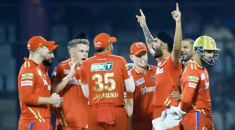 चौथे ओवर में गेंदबाजी करने आए अक्षर पटेल को प्रभसिमरन ने दो चौके लगाकर दबाव कम करने की कोशिश की, हालांकि अगले ही ओवर की पहली गेंद पर ईशांत ने लियाम लिविंगस्टोन (चार) को बोल्ड कर दिया। दूसरे छोर पर प्रभासिमरन ने छठे ओवर में अक्षर को छक्का जड़कर रनगति बढ़ाने की कोशिश की, हालांकि अक्षर ने जितेश शर्मा (पांच) को बोल्ड कर पंजाब को एक और झटका दिया। पावरप्ले के छह ओवर के बाद पंजाब का स्कोर 46 रन था और उसके तीन बल्लेबाज पवेलियन लौट चुके थे। इसके बाद प्रभसिमरन और सैम कुरेन ने संभलकर खेलते हुए ढीली गेंदों का इंतजार किया। प्रभसिमरन ने अपनी टीम को इन शुरुआती झटकों से निकालते हुए सैम करन के साथ 73 रन की साझेदारी की। करन इस 54 गेंद की साझेदारी में ज्यादा कुछ नहीं कर सके, लेकिन प्रभसिमरन ने 11वें ओवर में मिचेल मार्श को दो छक्के और एक चौका जड़कर अपने इरादे साफ कर दिये।