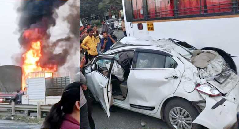 एजेंसी, पुणे। पुणे शहर के बाहरी इलाके में मुंबई-बेंगलुरु राजमार्ग पर एक पुल पर गुरुवार को दो बड़े कंटेनर ट्रक के बीच एक कार फंस कर चकनाचूर हो गई, वहीं तीनों वाहनों में आग लग जाने से 9 लोगों की मौत हो गई। मृतकों की पहचान की जा रही है। हादसे के बाद करीब एक घंटे तक हाईवे पर ट्रैफिक प्रभावित रहा। महाराष्ट्र के मुख्यमंत्री देवेंद्र फडणवीस ने मृतकों के परिवार को 5-5 लाख रुपए की मदद देने की घोषणा की है। यह जानकारी देते हुए पुलिस ने बताया कि शाम को नवले पुल पर हुए हादसे में करीब दस लोग घायल हो गए। इस बारे में एक पुलिस अधिकारी ने बताया, ‘‘प्रारंभिक जानकारी के मुताबिक, हादसे में 9 लोगों की मौत हो गई, जबकि आठ से दस अन्य घायल हो गए। घायलों को अस्पताल ले जाया गया है।’’ अधिकारी के मुताबिक, ‘‘हम इस बात की जांच कर रहे हैं कि हादसा कैसे हुआ। फ़िलहाल, हमारी प्राथमिकता यह सुनिश्चित करना है कि घायलों को अस्पताल में तुरंत इलाज मिले।’’ घटनास्थल पर दमकल विभाग ने पानी के टैंकर मौके पर भेजे और आग बुझाने के प्रयास जारी हैं। दुर्घटना के कारण व्यस्त राजमार्ग पर यातायात जाम लग गया। दुर्घटना के कारण दोनों ओर लंबी कतारें लग गई हैं।
