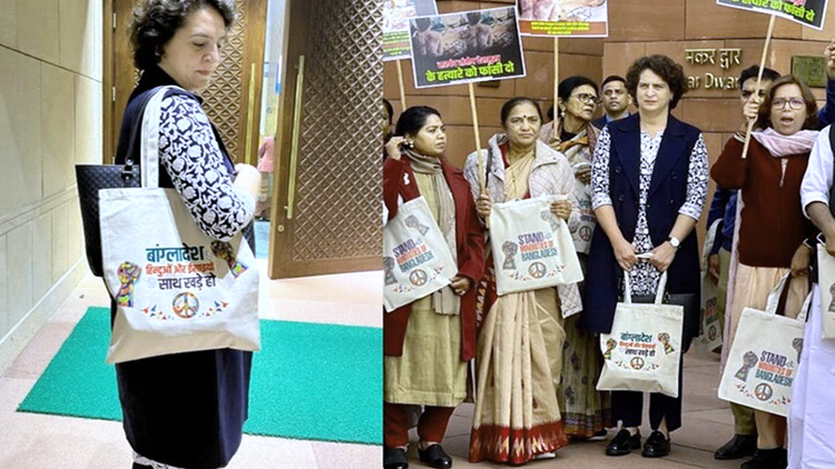 नई दिल्ली। कांग्रेस महासचिव और सांसद प्रियंका गांधी वाड्रा और पार्टी के कई अन्य सांसदों ने बांग्लादेश में हिंदू समुदाय तथा दूसरे अल्पसंख्यकों के खिलाफ अत्याचार के खिलाफ सोमवार को संसद परिसर में प्रदर्शन किया और सरकार से उनके लिए न्याय की मांग की। उन्होंने अपने हाथ में थैला भी ले रखा था जिस पर “बांग्लादेश के हिंदुओं और ईसाइयों के साथ खड़े हों” लिखा हुआ था। प्रियंका गांधी और कई अन्य सांसद संसद भवन में ‘मकर द्वार’ के निकट एकत्र हुए और ‘‘केंद्र सरकार जवाब दो’’ और ‘‘वी वांट जस्टिस’’ के नारे लगाए। कांग्रेस ने सोमवार को भी इस विषय को लेकर संसद परिसर में प्रदर्शन किया था। केरल के वायनाड से लोकसभा सदस्य प्रियंका गांधी ने लोकसभा में शून्यकाल के दौरान भी यह विषय उठाया था। वह सोमवार को फलस्तीनी लोगों के समर्थन में फलस्तीन लिखा हुआ हैंडबैग लेकर संसद पहुंची थीं।