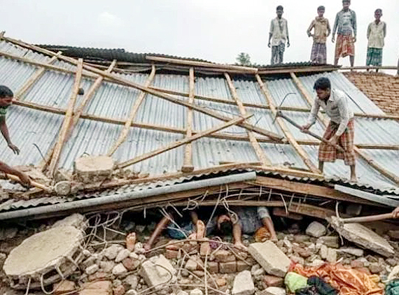 एजेंसी, छपरा। बिहार में सारण जिले के अकिलपुर थाना क्षेत्र में एक मकान की छत गिर जाने से एक ही परिवार के पांच लोगों की दबकर मौत हो गयी। पुलिस सूत्रों ने सोमवार को बताया कि रविवार की देर रात मानस गांव निवासी बब्लू खान के मकान की छत गिर गयी। इस घटना में घर में सो रहे पांच लोग घायल हो गये। घटना की सूचना मिलने पर मौके पर पहुंची पुलिस ने सभी पांच लोगों को इलाज के लिए दानापुर अनुमंडल अस्पताल पहुंचाया, जहां चिकित्सक ने सभी को मृत घोषित कर दिया। सूत्रों ने बताया कि मृतकों की पहचान बब्लू खान (32), उसकी पत्नी रौशन खातून (30), पुत्री रुकसार (12), चांदनी कुमारी (02) और पुत्र मोहम्मद चांद (10) के रूप में की गयी है। शवों को पोस्टमॉर्टम के लिये दानापुर अनुमंडल अस्पताल भेज दिया गया है। घटना के बाद चीख-पुकार मच गई और आस-पास के लोग दौड़कर मौके पर पहुंचे। पुलिस भी तुरंत घटनास्थल पर पहुंची और स्थानीय लोगों के प्रयास से मलबा हटाया गया। हालांकि, जब तक सभी को निकाला गया, तब तक उनकी मौत हो चुकी थी। थानाध्यक्ष ने बताया कि घर की छत गिरने से एक ही परिवार के पांच सदस्यों की जान चली गई। मृतकों में गृहस्वामी बबलू खान, उनकी पत्नी रौशन खातुन, पुत्री रूकशार, चांदनी और पुत्र मो चांद शामिल हैं। शवों को कब्जे में लेकर आवश्यक कार्रवाई की जा रही है।