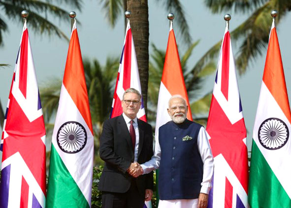 प्रधानमंत्री नरेन्द्र मोदी ने बृहस्पतिवार को अपने ब्रिटिश समकक्ष केअर स्टार्मर के साथ व्यापक चर्चा की। चर्चा के दौरान मुख्य रूप से व्यापार, रक्षा, सुरक्षा और महत्वपूर्ण प्रौद्योगिकी के क्षेत्रों में भारत-ब्रिटेन संबंधों को बढ़ावा देने पर ध्यान केंद्रित किया गया। ब्रिटिश नेता ब्रिटेन के 125 सबसे प्रमुख व्यापारिक नेताओं, उद्यमियों और शिक्षाविदों के एक प्रतिनिधिमंडल के साथ बुधवार सुबह दो दिवसीय यात्रा पर मुंबई पहुंचे। स्टार्मर की भारत यात्रा दोनों देशों द्वारा एक ऐतिहासिक मुक्त व्यापार समझौते पर हस्ताक्षर करने के ढाई महीने बाद हुई है। इस समझौते से बाजार पहुंच बढ़ेगी, शुल्क में कटौती होगी और 2030 तक द्विपक्षीय व्यापार दोगुना होने की उम्मीद है। प्रधानमंत्री मोदी की जुलाई में हुई लंदन यात्रा के दौरान व्यापार समझौते को अंतिम रूप दिया गया था। स्टार्मर ने बुधवार को अपनी टिप्पणी में कहा कि यह व्यापार समझौता दोतरफा विकास के लिए एक ‘‘लॉन्चपैड’’ है और इससे भारत के 2028 तक तीसरी सबसे बड़ी वैश्विक अर्थव्यवस्था बनने का मार्ग प्रशस्त होगा। उन्होंने कहा, ‘‘हमने जुलाई में भारत के साथ एक बड़ा व्यापार समझौता किया था, जो किसी भी देश द्वारा सबसे सुरक्षित है। हालांकि, कहानी यहीं खत्म नहीं होती।’’ उन्होंने कहा, ‘‘यह सिर्फ एक कागज का टुकड़ा नहीं है, यह विकास का एक ‘लॉन्चपैड’ है। भारत 2028 तक दुनिया की तीसरी सबसे बड़ी अर्थव्यवस्था बनने वाला है और उसके साथ व्यापार तेज और किफायती होने वाला है, ऐसे में हमारे सामने आने वाले अवसर बेजोड़ हैं।’’ इस वार्ता में भारतीय पक्ष द्वारा ब्रिटेन की धरती से कुछ खालिस्तान समर्थक तत्वों की गतिविधियों पर अपनी चिंताओं को उठाने के साथ-साथ विजय माल्या और नीरव मोदी सहित कई अरबपति भगोड़ों के ब्रिटेन से भारत प्रत्यर्पण की भी वकालत करने की उम्मीद है।