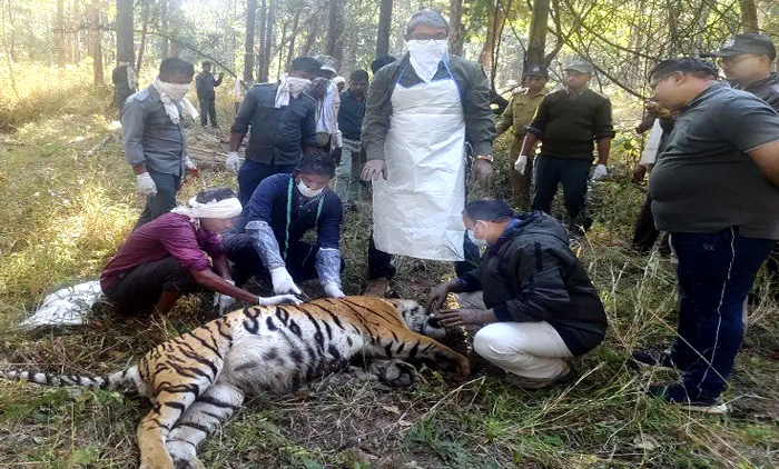 एनटीसीए के प्रोटोकॉल अनुसार एनटीसीए के निर्देश पर वन्यप्राणी विशेषज्ञ की उपस्थिति में पेंच के वन्यजीव चिकित्सक अखिलेश मिश्रा एवं पशु चिकित्सा विभाग के डॉ. मेश्राम ने बाघ के शव का पोस्टमार्टम किया। चिकित्सक दल को नर बाघ के पोस्टमार्टम में बाघ के गले एवं शरीर में दो-तीन अन्य जगहों पर अन्य बाघ के केनाइन (सबसे आगे के नुकीले दांत) से किए गए पंचर मार्क मिले एवं इन्हीं से हुए घावों के कारण अत्यधिक खून बहने से बाघ की मृत्यु होना प्रतीत हो रहा है। मृत बाघ के शरीर के सभी अंग जैसे नाखून, मूंछ के बाल, केनाइन दांत, शरीर के साथ सुरक्षित पाए गए हैं। पोस्टमार्टम के बाद बाघ के शव को जलाकर नष्ट करने के लिए तय भस्मीकरण समिति के सदस्योंं तथा अधिकारियों एवं कर्मचारियों की मौजूदगी में शव को पूर्ण रूप से जलाकर नष्ट किया गया।