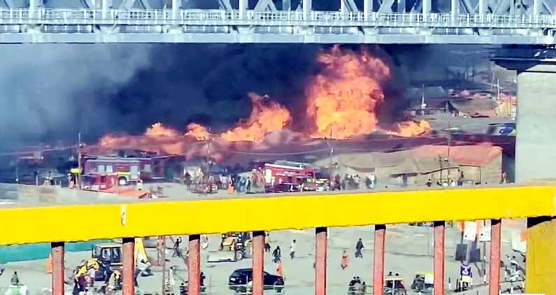 प्रयागराज। प्रयागराज महाकुंभ से एक बड़ी खबर आ रही है। यहां बने रेलवे ब्रिज के नीचे लगे टेंट में आग लगी है। फायर ब्रिगेड की कई गाड़ियां मौके पर मौजूद है, और आग बुझाने का काम कर रही हैं। बताया जा रहा है तुलसी मार्ग पर सेक्टर 19 रेलवे पुल नंबर 12 के नीचे विवेकानंद सेवा समिति वाराणसी के टेंट में यह आग लगी है। मौके पर राहत एवं बचाव कार्य जारी है। बताया जा रहा है कि 15 से 20 टेंट आग की जद में आने से जल गए हैं। मौके पर अफरातफरी का माहौल है। आग लगने का कारण स्पष्ट नहीं हो सका है। आग लगने की घटना के बाद चारों पीपा पुल को बंद कर दिया गया है। जिसके चलते श्रद्धालुओं की भीड़ जमा हो गई है। मेले के मुख्य अग्निशमन अधिकारी (सीएफओ) प्रमोद शर्मा ने एक न्यूज एजेंसी को बताया कि आग ने करीब 18 शिविरों को अपनी चपेट में ले लिया है। उन्होंने बताया कि आग पर काबू पाने के लिए दमकल की 15-16 गाड़ियां भेजी गई हैं। महाकुंभ नगर के अखाड़ा पुलिस थाना के प्रभारी भास्कर मिश्रा ने बताया, ‘‘महाकुंभ मेले के सेक्टर 19 में दो एलपीजी सिलेंडर फट गए, जिससे शिविरों में भीषण आग लग गई। अग्निशमन कर्मी आग बुझाने की कोशिश कर रहे हैं।’’