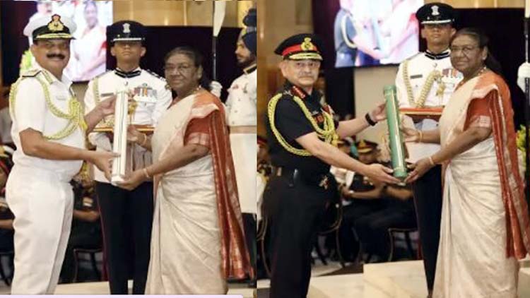 नई दिल्ली। राष्ट्रपति द्रौपदी मुर्मु ने सेना प्रमुख जनरल उपेंद्र द्विवेदी और नौसेना प्रमुख एडमिरल दिनेश कुमार त्रिपाठी सहित 31 वरिष्ठ सैन्य अधिकारियों को शुक्रवार को परम विशिष्ट सेवा पदकों से सम्मानित किया। राष्ट्रपति मुर्मु ने यहां राष्ट्रपति भवन में आयोजित रक्षा अलंकरण समारोह के दूसरे चरण के दौरान सैन्य कर्मियों को विशिष्ट और लेखनिया सेवा के लिए ये पदक के प्रदान किए। उन्होंने सशस्त्र बलों और भारतीय तटरक्षक बल के 94 कर्मियों को विशिष्ट सेवा अलंकरण भी प्रदान किए। इन अलंकरणों में 31 परम विशिष्ट सेवा पदक (पीवीएसएम), चार उत्तम युद्ध सेवा पदक (यूवाईएसएम), दो बार सहित अति विशिष्ट सेवा पदक (एवीएसएम), और 57 एवीएसएम पदक शामिल हैं। हाल ही में सेना प्रमुख और नौसेना प्रमुख नियुक्त किए गए जनरल दिवेदी और एडमिरल त्रिपाठी को भी परम विशिष्ट सेवा पदक से सम्मानित किया गया है। इस अवसर पर उपराष्ट्रपति जगदीप धनखड़, रक्षा मंत्री राजनाथ सिंह, रक्षा राज्य मंत्री संजय सेठ और वरिष्ठ सैन्य अधिकारियों के साथ-साथ अनेक गण मान्य व्यक्ति उपस्थित थे।