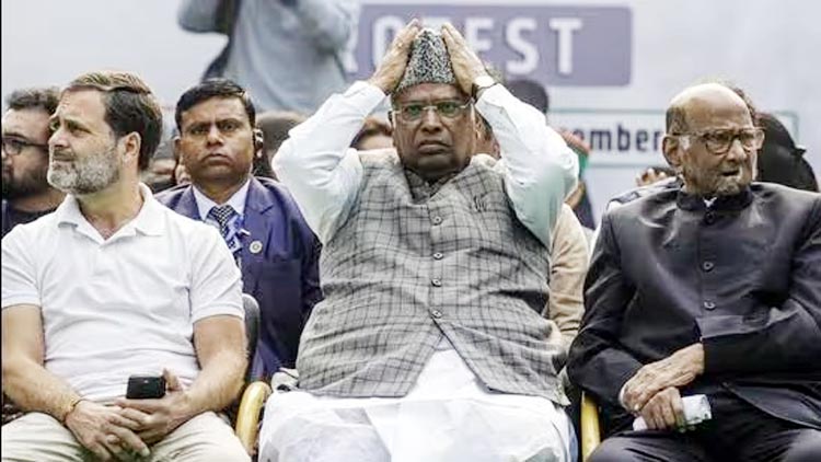 नई दिल्ली। कांग्रेस अध्यक्ष मल्लिकार्जुन खरगे ने शुक्रवार को राज्यसभा के सभापति जगदीप धनखड़ का नाम लिए बगैर कहा कि उन्हें यह जानकर बहुत धक्का लगा कि संवैधानिक पदों पर बैठे लोग संसद में जाति का नाम लेकर कहते हैं कि उनका अपमान किया गया है। उन्होंने कहा कि सरकार ने लोकतंत्र को खत्म करने का काम किया है। उन्होंने शीतकालीन सत्र में 146 विपक्षी सांसदों के निलंबन के खिलाफ जंतर-मतर पर आयोजित विपक्षी दलों के विरोध प्रदर्शन में यह दावा भी किया कि विपक्षी गठबंधन ‘इंडियन नेशनल डेवलपमेंटल इन्क्लूसिव अलायंस’ (इंडिया) के घटक दलों के सभी नेता एकजुट हो गए हैं और अब प्रधानमंत्री नरेन्द्र मोदी अकेले कुछ नहीं कर सकते। खरगे ने कहा, ‘‘ मुझे इस बात का बहुत धक्का लगा कि संवैधानिक पद पर बैठे लोग यह कहते हैं कि वो किसी जाति से संबंध रखते हैं और उनका अपमान किया गया।’’