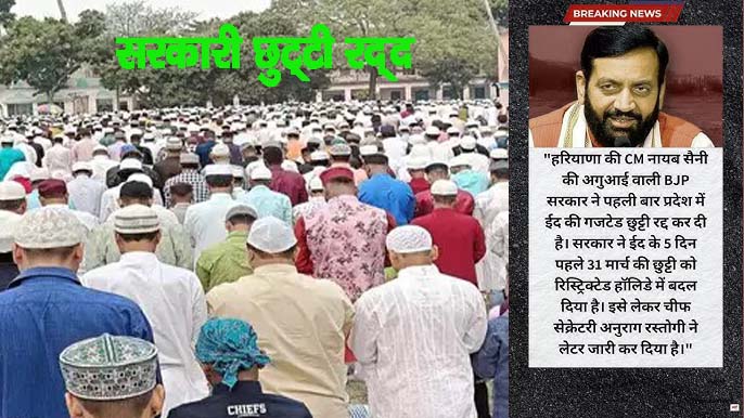 एजेंसी, करनाल| हरियाणा में इस साल ईद के मौके पर सरकारी कर्मचारियों को छुट्टी नहीं मिलेगी, क्योंकि नायब सिंह सैनी के नेतृत्व वाली बीजेपी सरकार ने एक नया नोटिफिकेशन जारी कर ईद की छुट्टी को रद्द कर दिया है। इस फैसले ने राज्य में चर्चा का माहौल गर्म कर दिया है। सरकार ने अपने ताजा आदेश में ईद को गजेटेड हॉलीडे की सूची से हटाकर इसे रेस्ट्रिक्टेड हॉलीडे (RH) घोषित किया है। इसका मतलब है कि अब यह छुट्टी वैकल्पिक होगी और सरकारी दफ्तरों में कामकाज सामान्य रूप से जारी रहेगा।