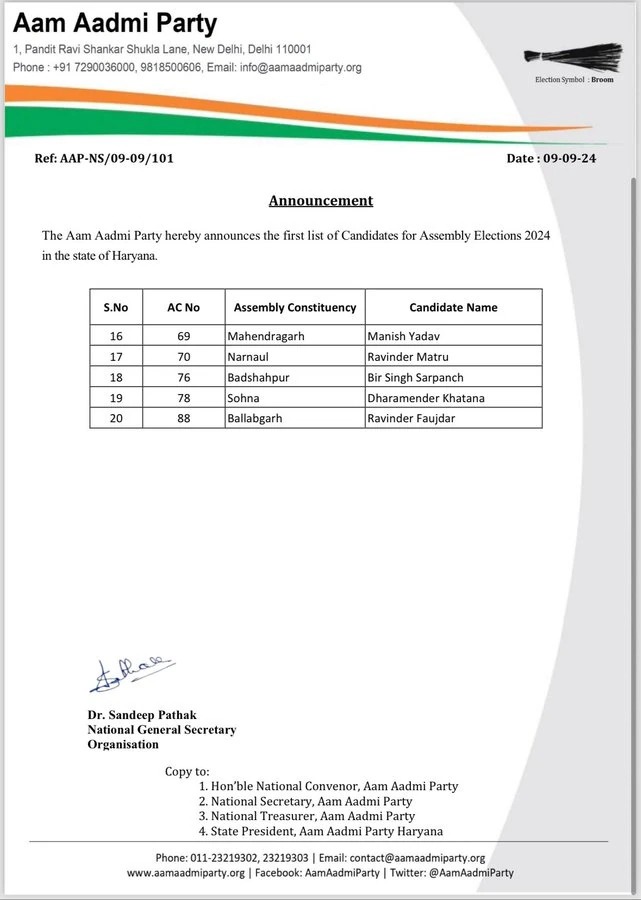 नई दिल्ली। आम आदमी पार्टी (आप) ने हरियाणा विधानसभा चुनाव के लिए 20 उम्मीदवारों की अपनी पहली सूची सोमवार को जारी की, जिससे कांग्रेस के साथ गठबंधन के लिए वार्ता में बाधा पैदा होने का संकेत मिलता है। हरियाणा की 90 सदस्यीय विधानसभा के लिए नामांकन दाखिल करने की अंतिम तिथि 12 सितंबर है। राज्य में मतदान पांच अक्टूबर को होगा। मतगणना आठ अक्टूबर को होगी। पार्टी ने हरियाणा इकाई के उपाध्यक्ष अनुराग ढांडा को कलायत से और इंदु शर्मा को भिवानी से मैदान में उतारा है। विकास नेहरा को महम से और बिजेंद्र हुड्डा को रोहतक से मैदान में उतारा गया है।