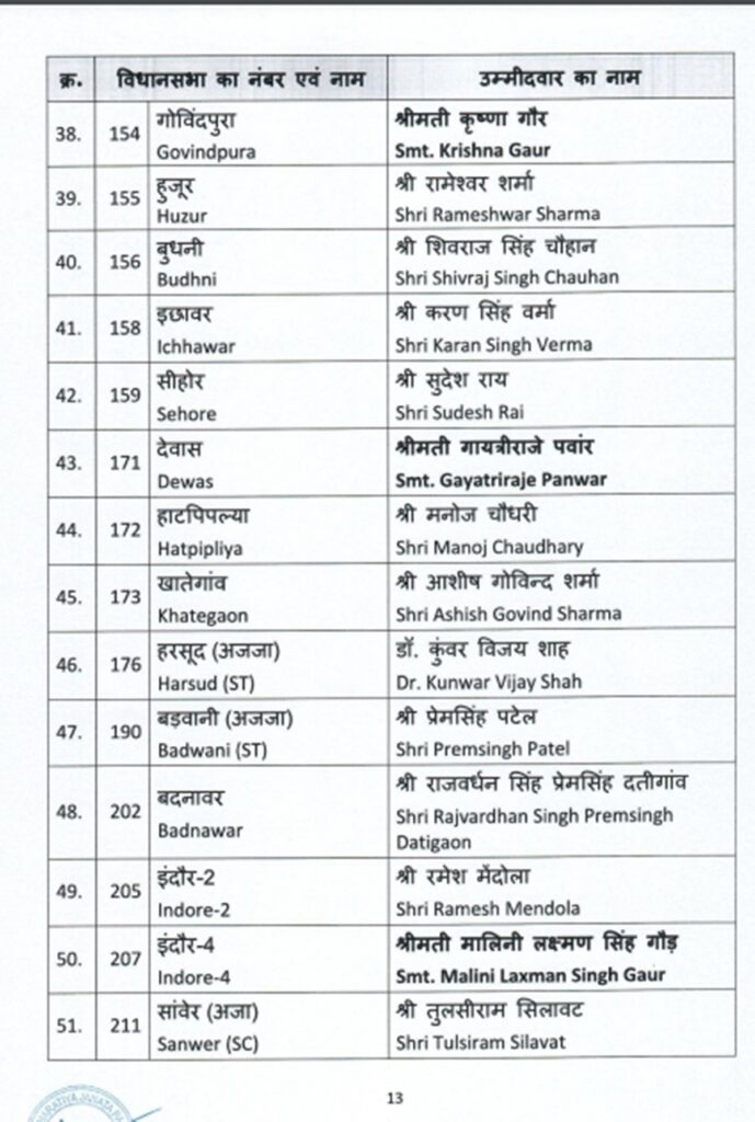 राज्य सरकार में मंत्री नरोत्तम मिश्रा फिर से दतिया विधानसभा से अपनी किस्मत आजमाएंगे। विश्वास सारंग एक बार फिर नरेला से उम्मीदवार बनाए गए हैं। पूर्व मुख्यमंत्री बाबूलाल गौर की बहू कृष्णा गौर फिर से गोविंदपुरा से चुनाव लड़ेंगी। पार्टी के वरिष्ठ नेता जदगीश देवड़ा को मल्हारगढ़, अरविंद सिंह भदौरिया को अटेर, प्रद्युम्न सिंह तोमर को ग्वालियर, गोपाल भार्गव रेहली से और सागर से शैलेन्द्र जैन को पार्टी ने उम्मीदवार बनाया है। मध्य प्रदेश की 230 सदस्यीय विधानसभा के आगामी चुनाव के लिए 17 नवंबर को मतदान होगा और मतों की गिनती तीन दिसंबर को होगी।