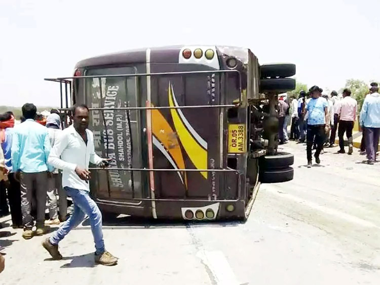 उमरिया। नेशनल हाईवे ओवर ब्रिज के ऊपर अचानक बाइक सामने आ जाने के चलते बस अनियंत्रित होकर पलट गई। मुख्यमंत्री के कार्यक्रम स्थल से 5 किमी पहले हुए हादसे में तीन लोगों की मौत हो गई जबकि कई अन्‍य ग्रामीण घायल हो गए हैं। घायलों को उमरिया जिला अस्पताल में भर्ती कराया गया है, जहां 5 की हालत गंभीर बताई जाती है। वहीं मुख्यमंत्री ने मृतकों के स्वजनों को 10 लाख रुपये और योग्यतानुसार सरकारी नौकरी देने की घोषणा की है जबकि गंभीर घायलों का पूरा उपचार और 50 हजार रुपये व साधारण घायलों को 10 हजार रुपये राहत के तौर पर देने घोषणा की।