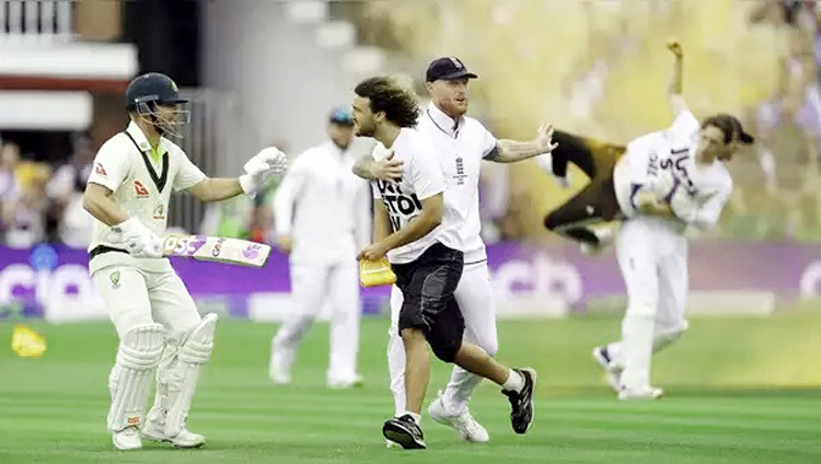 लंदन। इंग्लैंड और आस्ट्रेलिया के बीच बुधवार को दूसरे एशेज टेस्ट के पहले दिन का खेल शुरू होने के समय ‘जस्ट स्टॉप आइल’ ग्रुप के दो प्रदर्शनकारी मैदान में घुस गए और करीब पांच मिनट तक खेल बाधित रहा। पर्यावरण के लिये काम कर रहे इन प्रदर्शनकारियों ने मैदान पर नारंगी पाउडर डालने की कोशिश की लेकिन दोनों टीमों के खिलाड़ियों ने रोका।