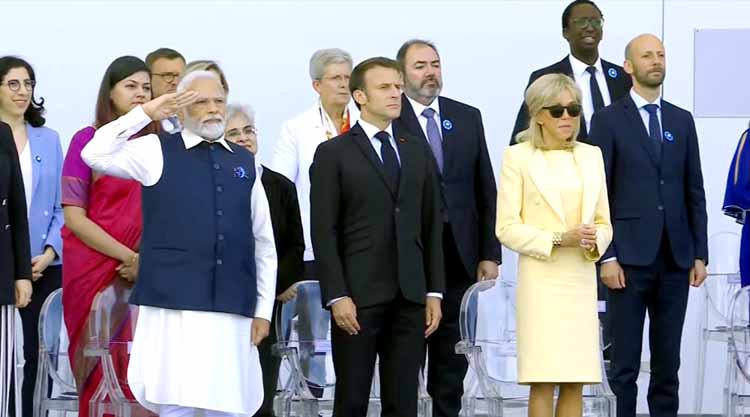 पेरिस| प्रधानमंत्री नरेंद्र मोदी शुक्रवार को फ्रांस की बैस्टिल डे परेड में बतौर मुख्य अतिथि शामिल हुए हैं। फ्रांस की प्रथम महिला ब्रिजेट मैक्रों और फ्रांस के प्रधानमंत्री एलिज़ाबेथ बोर्न ने पेरिस में बैस्टिल डे परेड में पीएम मोदी का स्वागत किया। राष्ट्रपति इमैनुएल मैक्रों ने मोदी को गले लगाकर स्वागत किया। परेड में भारतीय राफेल ने उड़ा भरी। तीनों सेनाओं के मार्चिंग दस्ते के 269 जवानों ने परेड में हिस्सा लिया। उनकी एंट्री सारे जहां से अच्छा की धुन के साथ हुई।